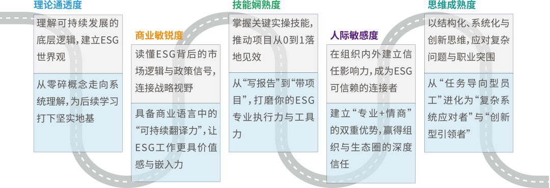 课程设计了清晰的 “优才赋能模型”:从梳理ESG知识框架,到独立完成项目方案,再到在企业内部推动落地、获得上级认可,让你的成长有迹可循,价值看得见。